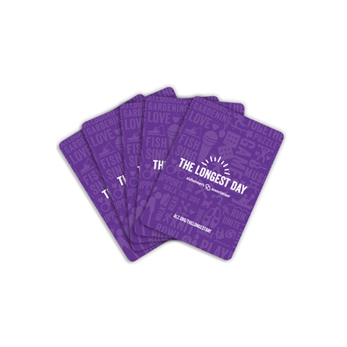 Each deck of playing cards features The Longest Day logo and includes an insert card about the 10 Warning Signs of Alzheimer's Disease.